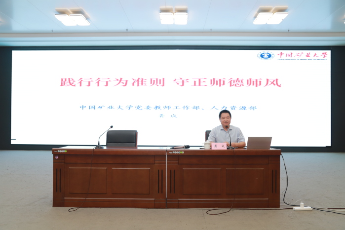 龚成以“践行行为准则 守正师德师风”为主题,从四个维度进行了深入浅出地讲解。在思想引领方面,生动阐释了“四有”好老师的深刻内涵,强调教师要坚守教育初心,担当育人使命;在制度规范方面,重点解读了《新时代高校教师职业行为十项准则》等文件的核心要义,通过具体案例说明师德考核“一票否决制”的实施要点;在警示教育环节,选取近年来高校教师违反师德的典型案例进行深入剖析,以案示警、以案明纪;在经验做法方面,分享了中国矿业大学在师德建设方面的有效路径和创新举措。